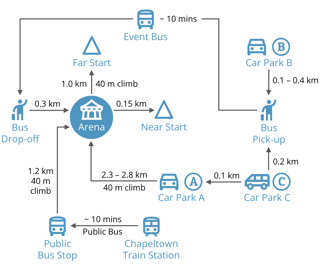 For those using public transport, Chapeltown Train Station - a 12-minute train ride from Sheffield - is a 3.5km walk from the Arena. Taking the frequent public bus service from Chapeltown to the Wortley Road/Thompson Hill stop (10 mins) reduces this walk to just 1.2km.