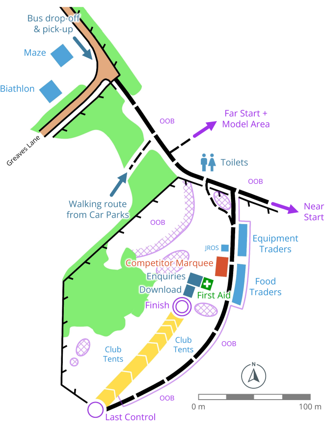 For environmental reasons there are out of bounds areas clearly marked on the map. Do not go into these. Near the Arena, there will be tape around a model aircraft flying area, two patches of Japanese Knotweed and wet areas where orchids grow. Do not cross the tapes. The large grassland to the east of the Arena, again with wet and orchid patches is out of bounds to orienteers. There may be small areas on the courses which are taped off to protect nesting birds and wild flowers - please avoid going into these areas and making any noise near them.