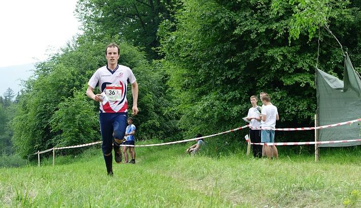 In the men’s relay the first leg saw Hector Haines just pip Kris Jones to the finish, 90 seconds down on the lead. Kris lost some time on control 6 but then ran confidently through the rocky green section to meet Hector’s gaffle for the last part of the course. Second leg for the 2nd team was Peter Hodkinson, who started out with Baptiste Rollier and hung with the Swiss 2nd team to pull through to near the lead. Peter just lost the back of the Swiss though on the final gaffle with a small mistake but still handed over in 6th. Ralph Street made small errors and set Graham Gristwood out on last leg with around 3 minutes to the leaders. Alan (pictured), tired after four races, started just behind a strong pack and had to run his own race. Graham missed in the green ( at a controversial control) both our men’s teams ended up finishing together, some 6 mins behind the winners, in 11th and 12th (9th Nation).